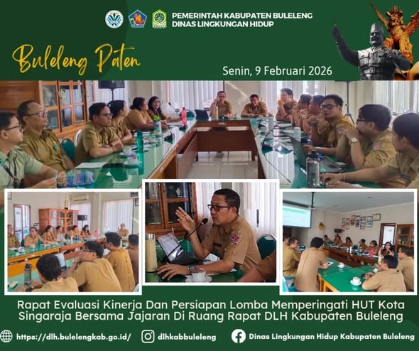 Dalam rangka evaluasi kinerja dan persiapan HUT Kota Singaraja, Kepala Dinas Lingkungan Hidup Kabupaten I Gede Putra Aryana didampingi Sekretaris LH melaksanakan rapat bersama pejabat struktural dan staf di Ruang Rapat DLH Kabupaten Buleleng Senin , 09 Februari 2026.