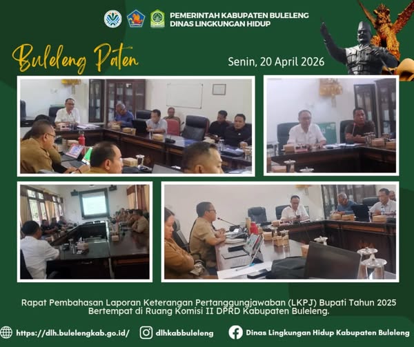 Senin, 20 April 2026 bertempat di ruang Komisi II DPRD Kabupaten Buleleng, Kepala Dinas Lingkungan Hidup Kabupaten Buleleng, I Gede Putra Aryana, S.Sos., M.A.P, didampingi Kassubag Keuangan dan Perencana Ahli Muda menghadiri rapat Pembahasan Laporan Keterangan Pertanggungjawaban (LKPJ) Bupati Tahun 2025.