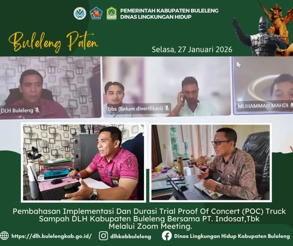 Kepala Dinas Lingkungan Hidup Kabupaten Buleleng, I Gede Putra Aryana, bersama Plt. Kepala Bidang Pengelolaan Sampah dan Limbah B3 I Putu Indrawan mengikuti pembahasan implementasi dan durasi trial Proof Of Concert (POC) truck sampah DLH Kab. Buleleng Buleleng bersama PT. Indosat,Tbk melalui zoom meeting selasa, 27 Januari 2026.