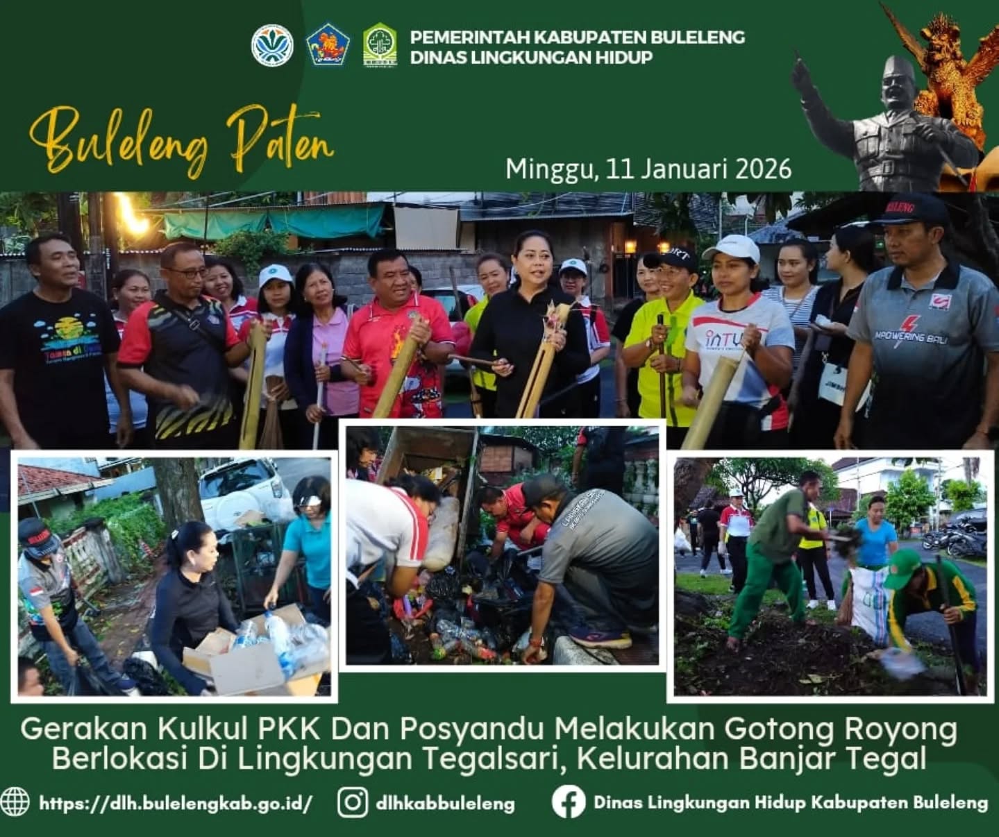 Menindaklanjuti arahan Ketua Tim Penggerak PKK Provinsi Bali, Ny. Putri Koster yang mencanangkan Gerakan Kulkul PKK dan Posyandu, Kepala Dinas Lingkungan Hidup Kabupaten Buleleng beserta staf ikut serta mendampingi Ketua TP PKK Kabupaten Buleleng Ny. Wardhany Sutjidra bersama anggota PKK Kecamatan Buleleng dan PKK Kelurahan Banjar Tegal melaksanakan gerakan kulkul PKK dan Posyandu dalam upaya membangkitkan kembali semangat gotong royong sekaligus meningkatkan kepedulian masyarakat terhadap kebersihan lingkungan yang berlokasi di Tegalsari, Kelurahan Banjar Tegal.