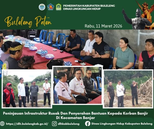 Dalam rangka peninjauan infrastruktur rusak dan penyerahan bantuan kepada korban banjir, Kepala Dinas Lingkungan Hidup Kabupaten Buleleng ikut serta dalam kunjungan rombongan Wakil Gubernur Bali didampingi Wakil Bupati Buleleng melakukan peninjauan langsung ke lokasi terdampak banjir di Kecamatan Banjar Rabu, 11 Maret 2026. Wakil Gubernur Bali sangat memberikan support melalui sumbangan kepada korban bencana banjir dan bangunan sekolah yang mengalami kerusakan parah. Semoga wilayah Kecamatan Banjar segera pulih dan korban segera ditemukan. Untuk mendukung kegiatan kebersihan, truck dan tenaga pengangkutan sampah DLH setiap hari bertugas di Kecamatan Banjar dalam kegiatan bersih-bersih di lapangan dan percepatan evakuasi korban yang belum ditemukan.