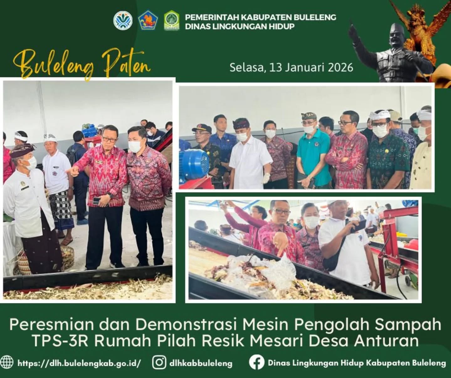 Wakil Bupati Buleleng bersama Kepala Dinas Lingkungan Hidup Kabupaten Buleleng I Gede Putra Aryana didampingi oleh Plt. Kepala Bidang Pengelolaan Sampah dan Limbah B3 I Putu Indrawan menghadiri undangan Peresmian dan Demonstrasi Mesin Pengolah Sampah Reduce, Reuse, Recycle (TPS 3R) TPS-3R Rumah Pilah Resik Mesari Desa Anturan, Desa Anturan, Kecamatan Buleleng, Selasa (13/1).
