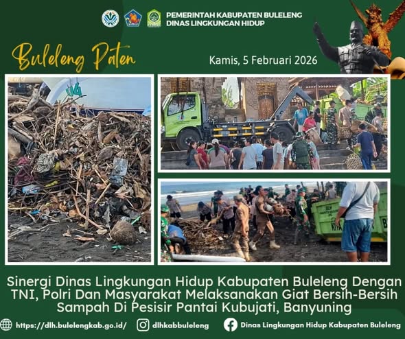 Menindaklanjuti arahan tentang Gerakan Buleleng Bersih Sampah, Pemerintah Kabupaten Buleleng melalui Dinas Lingkungan Hidup Kabupaten Buleleng bersama unsur TNI, Polri, serta partisipasi aktif masyarakat melaksanakan aksi bersih-bersih pantai di kawasan Pantai Kubujati, Kelurahan Banyuning, pada Kamis (5/2/2026).