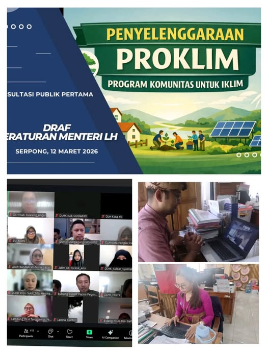 Penelaah Teknis Kebijakan Bidang Tata Lingkungan mengikuti secara daring Konsultasi Publik Pertama Draf Peraturan Menteri Lingkungan Hidup/ Badan Pengendalian Lingkungan Hidup tentang Penyelenggaraan ProKlim yang akan diselenggarakan oleh Kementerian Lingkungan Hidup/Badan Pengendalian Lingkungan Hidup.