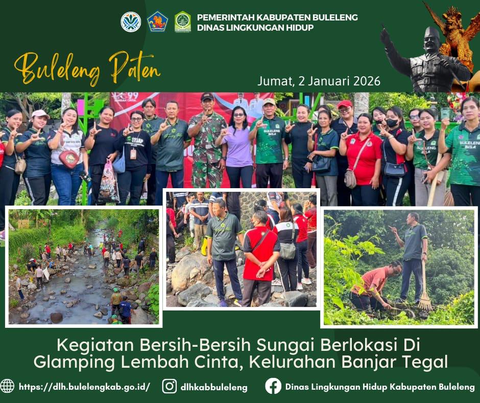 Dalam rangka mengantisipasi dampak musim penghujan serta menindaklanjuti adanya pembuangan sampah, Kepala Dinas Lingkungan Hidup I Gede Putra Aryana, S.Sos., M.A.P bersama jajaran Dinas Lingkungan Hidup Kabupaten Buleleng melaksanakan Gerakan Buleleng Aksi Bersih Sampah bertempat di Glamping Lembah Cinta Kelurahan Banjar Tegal, Jumat (2/1/2026). Kegiatan ini difokuskan pada pembersihan aliran sungai dan area sekitar jembatan yang berpotensi menjadi titik penumpukan sampah kiriman akibat tingginya curah hujan. Kegiatan pembersihan dilakukan dengan pengangkatan sampah organik dan anorganik yang menyangkut di badan sungai maupun di sekitar jembatan. Sampah anorganik dan organik berupa plastik, ranting, dan dedaunan. Turut hadir Camat Buleleng beserta jajaran, Direktur Perumda Tirta Hita Buleleng beserta jajaran serta unsur TNI dan Polri.