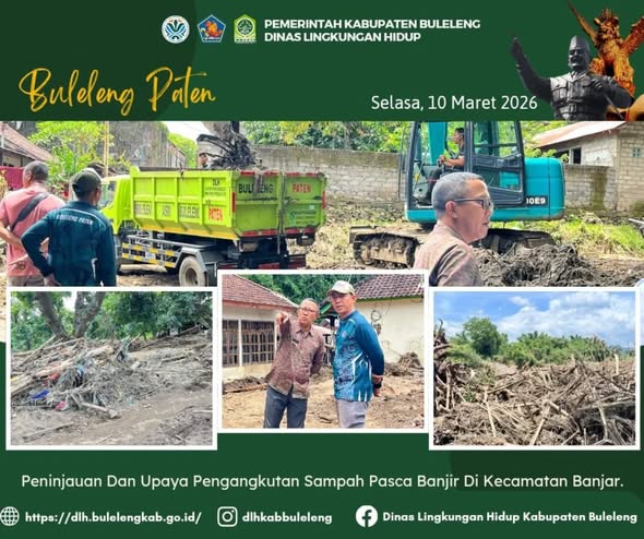 Dalam rangka memastikan kondisi lingkungan pasca terjadinya bencana banjir, Kepala Dinas Lingkungan Hidup Kabupaten Buleleng, I Gede Putra Aryana, didampingi oleh Kepala Bidang Pengelolaan Sampah dan Limbah Bahan Berbahaya dan Beracun (B3), Made Agus Suardana, melaksanakan kegiatan pemantauan dan peninjauan kembali di beberapa titik wilayah terdampak banjir di Kecamatan Banjar, Kabupaten Buleleng.