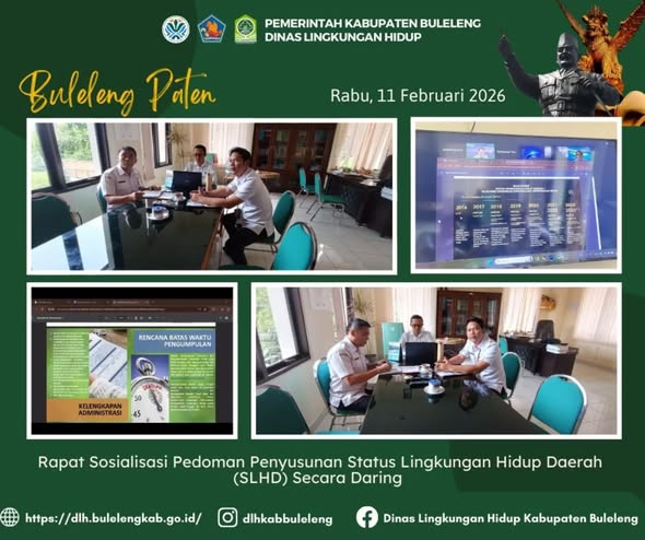 Dalam rangka mewujudkan perlindungan dan pengelolaan lingkungan hidup yang berkelanjutan serta memperkuat akuntabilitas publik di daerah, Kepala Dinas Lingkungan Hidup Kabupaten Buleleng, I Gede Putra Aryana, didampingi Kepala Bidang Penaatan dan Peningkatan Kapasitas Lingkungan Hidup (PKLH) I Putu Indrawan serta Kepala Bidang Tata Lingkungan Made Adiana, mengikuti kegiatan Sosialisasi Pedoman Penyusunan Status Lingkungan Hidup Daerah (SLHD) yang dilaksanakan secara daring dari Ruang Kepala Dinas Lingkungan Hidup Kabupaten Buleleng pada Rabu, (11/2/2026). Kegiatan ini turut diikuti oleh Dinas Lingkungan Hidup Provinsi dan Kabupaten/Kota se-Indonesia.