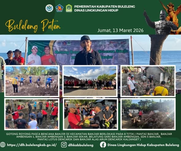 Dalam rangka percepatan pemulihan kondisi kawasan rumah yang terdampak banjir, Pemerintah Daerah Kabupaten Buleleng melaksanakan kegiatan gotong royong bersih sampah pada kawasan terdampak banjir dan penyerahan sembako kepada warga terdampak banjir di Kecamatan Banjar.