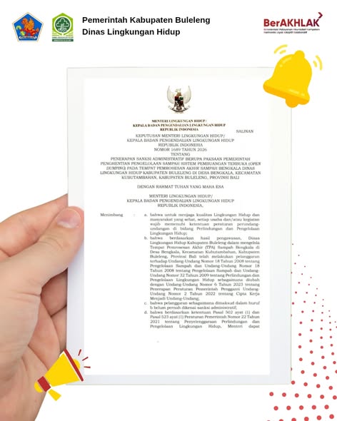 Sehubungan dengan diterbitkannya Surat Keputusan Menteri Lingkungan Hidup/Badan Pengendalian Lingkungan Hidup Nomor 1689 Tahun 2026 tanggal 8 April 2026, bersama ini kami sampaikan bahwa Dinas Lingkungan Hidup Kabupaten Buleleng menerima sanksi administratif berupa paksaan pemerintah.