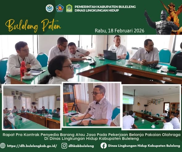 Rabu, 18 Februari 2026, Penandatanganan kontrak pengadaan barang/jasa, Kepala Dinas Lingkungan Hidup Kabupaten Buleleng didampingi Sekretaris Dinas dan Kasubag Umum melaksanakan rapat pra kontrak penyedia barang/jasa pada pekerjaan belanja pakaian olahraga bertempat di Ruang Rapat DLH Kabupaten Buleleng.